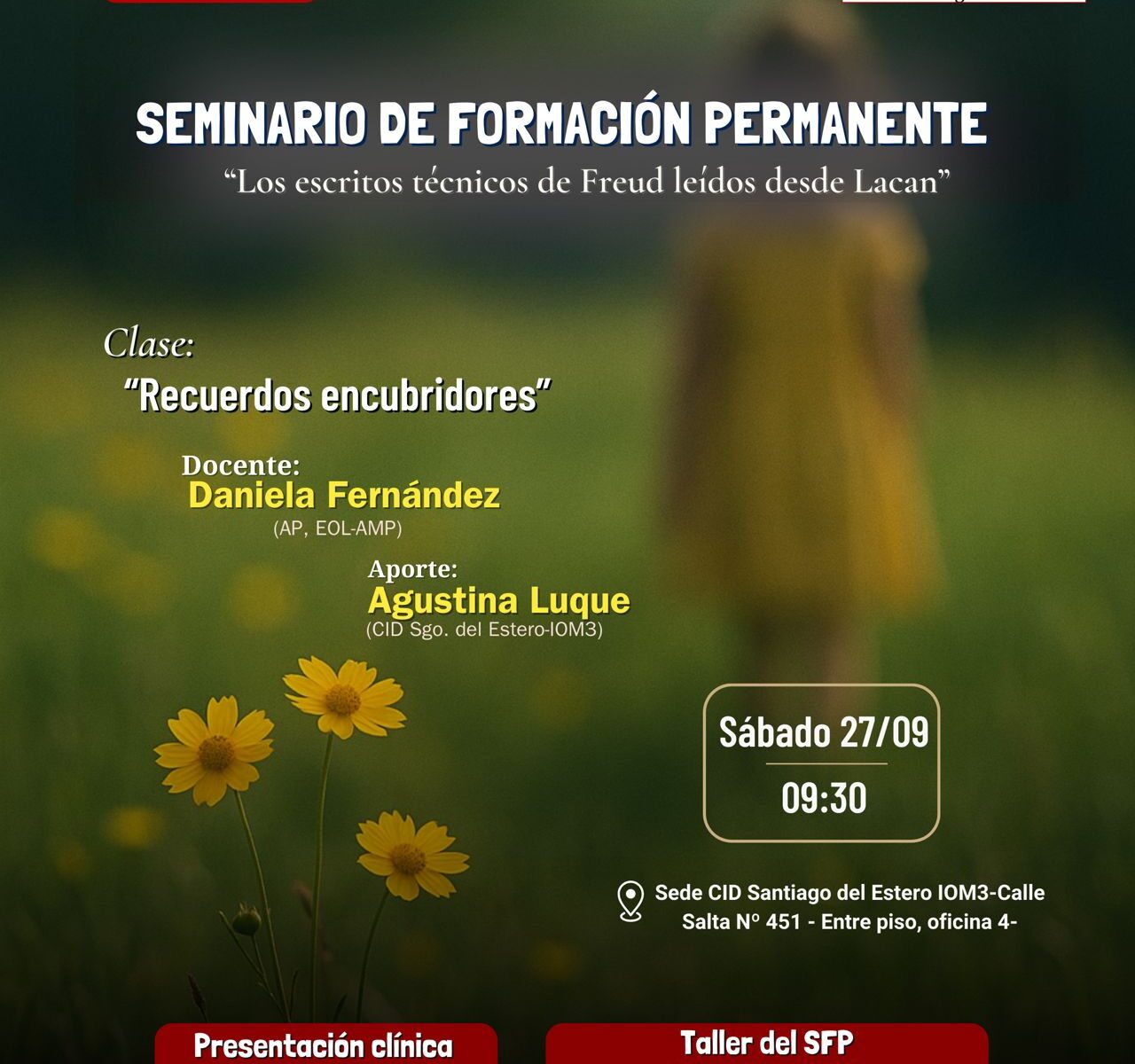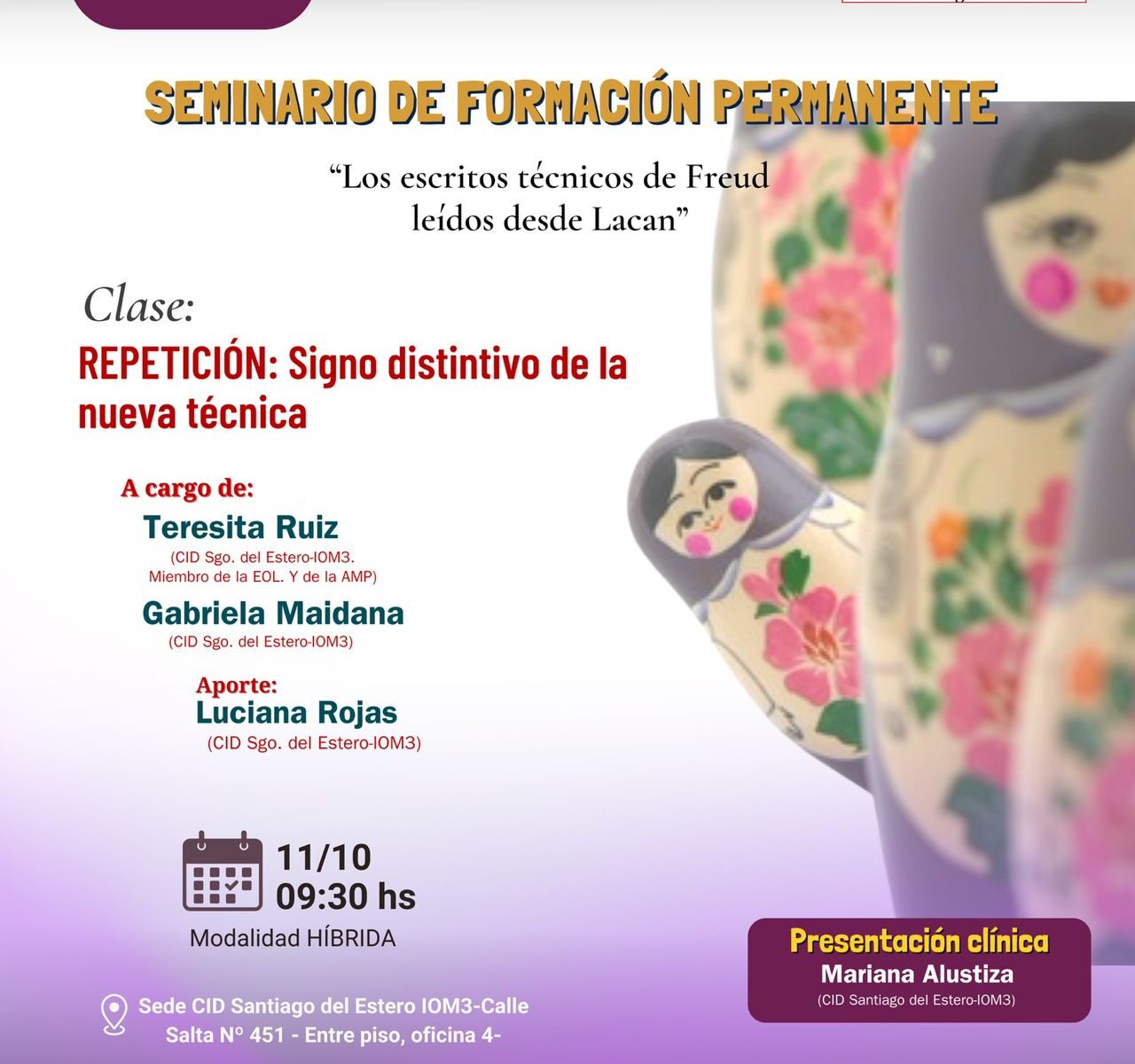 Sabedores que los que asistimos al Cid-Sgo. Queremos continuar con la formación en psicoanálisis. Aquí en nuestra provincia, la tarea en su mayoría la realizamos en Instituciones de educación, en clínicas privadas o en hospitales públicos, donde formamos parte de un equipo con profesionales de otras disciplinas, se trata entonces en el día a día, de establecer una ética, ante el malentendido que habita en las Instituciones. ¿Cómo hacer?