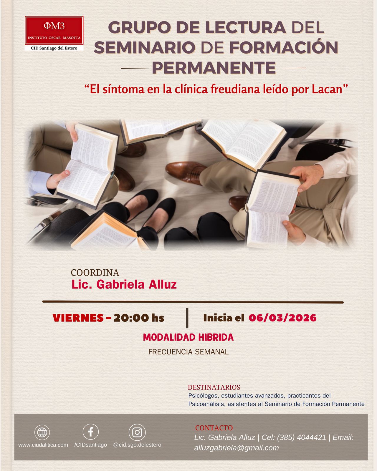El Grupo de Lectura del Seminario de Formación Permanente tiene como objetivo el trabajo exhaustivo de los textos bibliográficos propuestos por el programa 2026 y 2027. El programa nos invita a recorrer los casos clínicos de la obra freudiana, leídos por Lacan. El valor de la enseñanza de Lacan es justamente el re-descubrimiento de la obra freudiana recuperando el valor de las formaciones del inconsciente y el sentido del síntoma que es el tema que nos convoca este Seminario. Les proponemos sumarse al intercambio enriquecedor de la lectura compartida que nos a-una dando lugar a un nuevo saber entre varios.